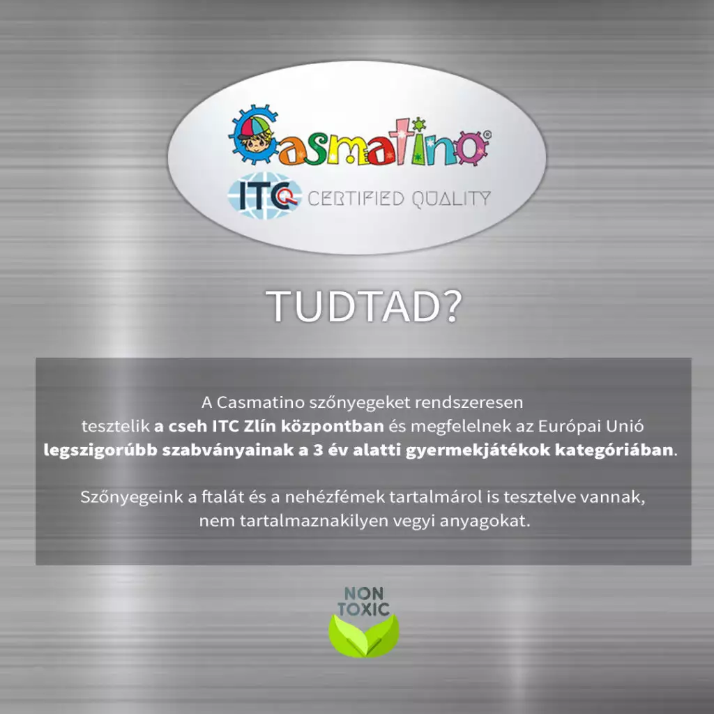 A Casmatino szőnyegeket rendszeresen tesztelik a cseh ITC Zlín központban és megfelelnek az Európai Unió legszigorúbb szabványainak a 3 év alatti gyermekjátékok kategóriában. Szőnyegeink a ftalát és a nehézfémek tartalmárol is tesztelve vannak és nem tartalmaznak semmilyen káros vegyi anyagot.