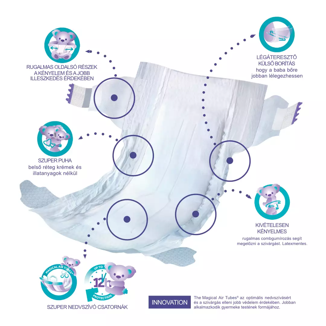A Drylock technológia és a Magical Tubes® nedvszívó csatornarendszer segít a folyadékot gyorsan a pelenka belsejébe vezetni, ahol egyenletesen oszlik el. Ez hozzájárul a száraz érzethez és csökkenti a szivárgás kockázatát.